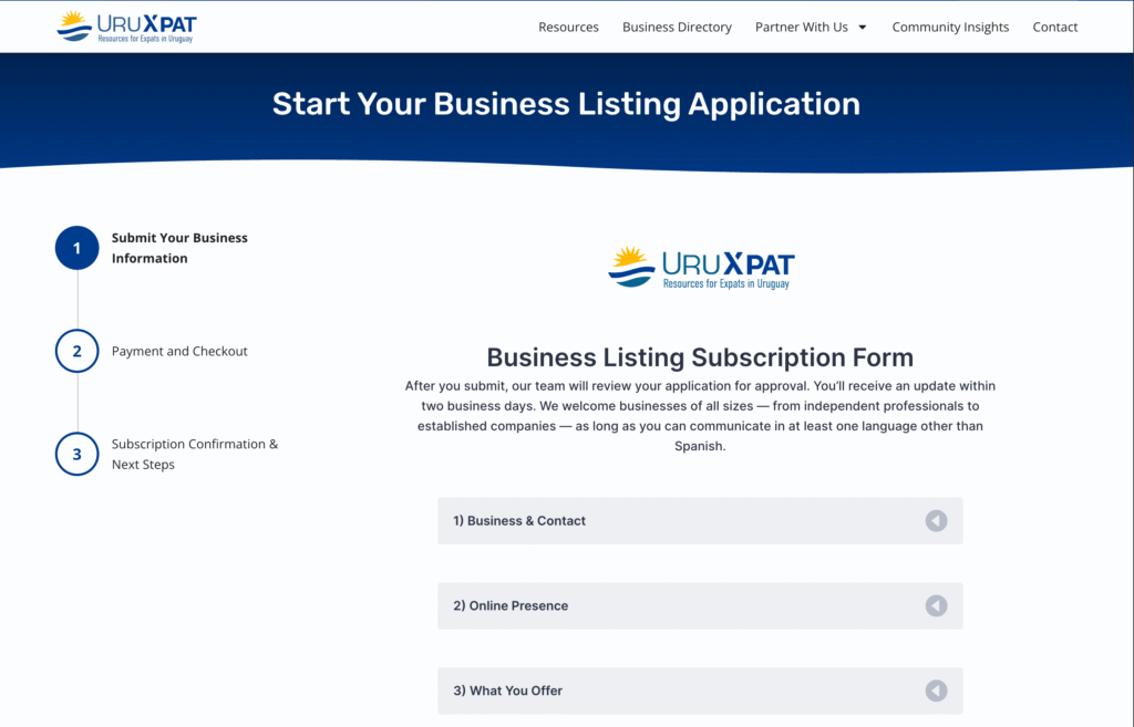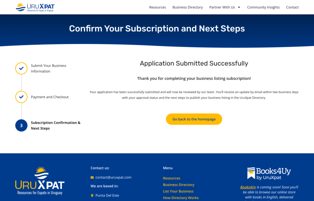 You’ll receive an email notification within two business days confirming whether your listing has been approved and outlining the next steps to get your business live on the UruXpat Directory.