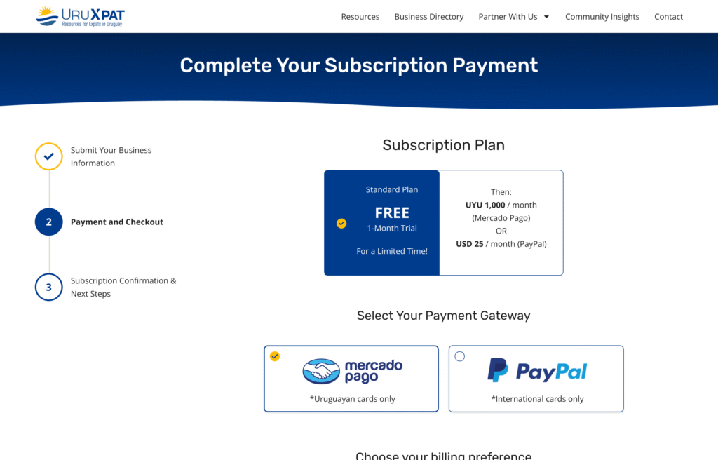 Business listings cost USD 25/month (via PayPal) or UYU 1,000/month (via Mercado Pago). All new listings include a 1-month free trial before billing begins. The payment methods available are: